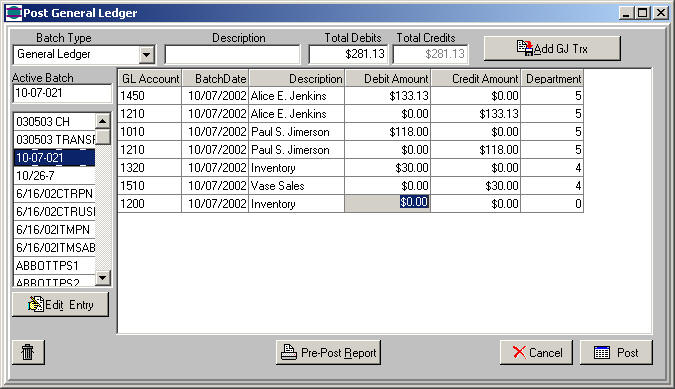 This function allows you to Add adjusting entries or edit journal entries in a batch. Double click the batch you want to work with to review the transactions for that batch.